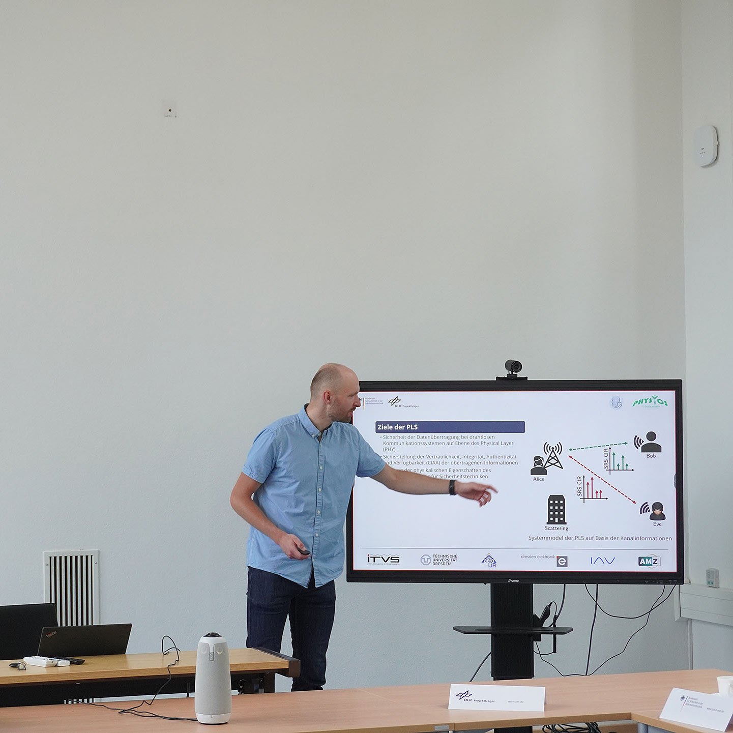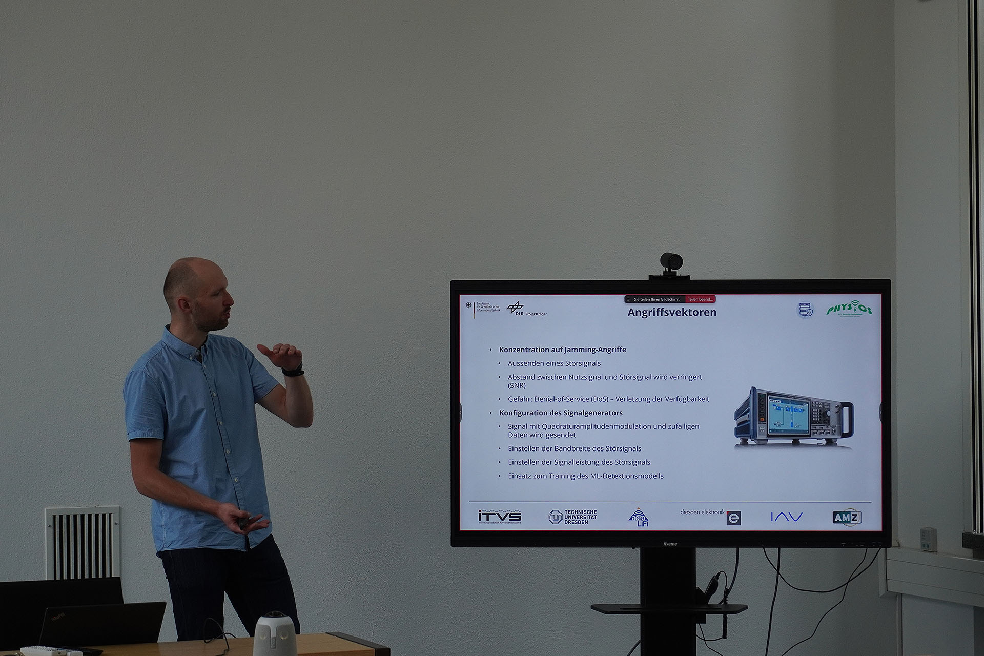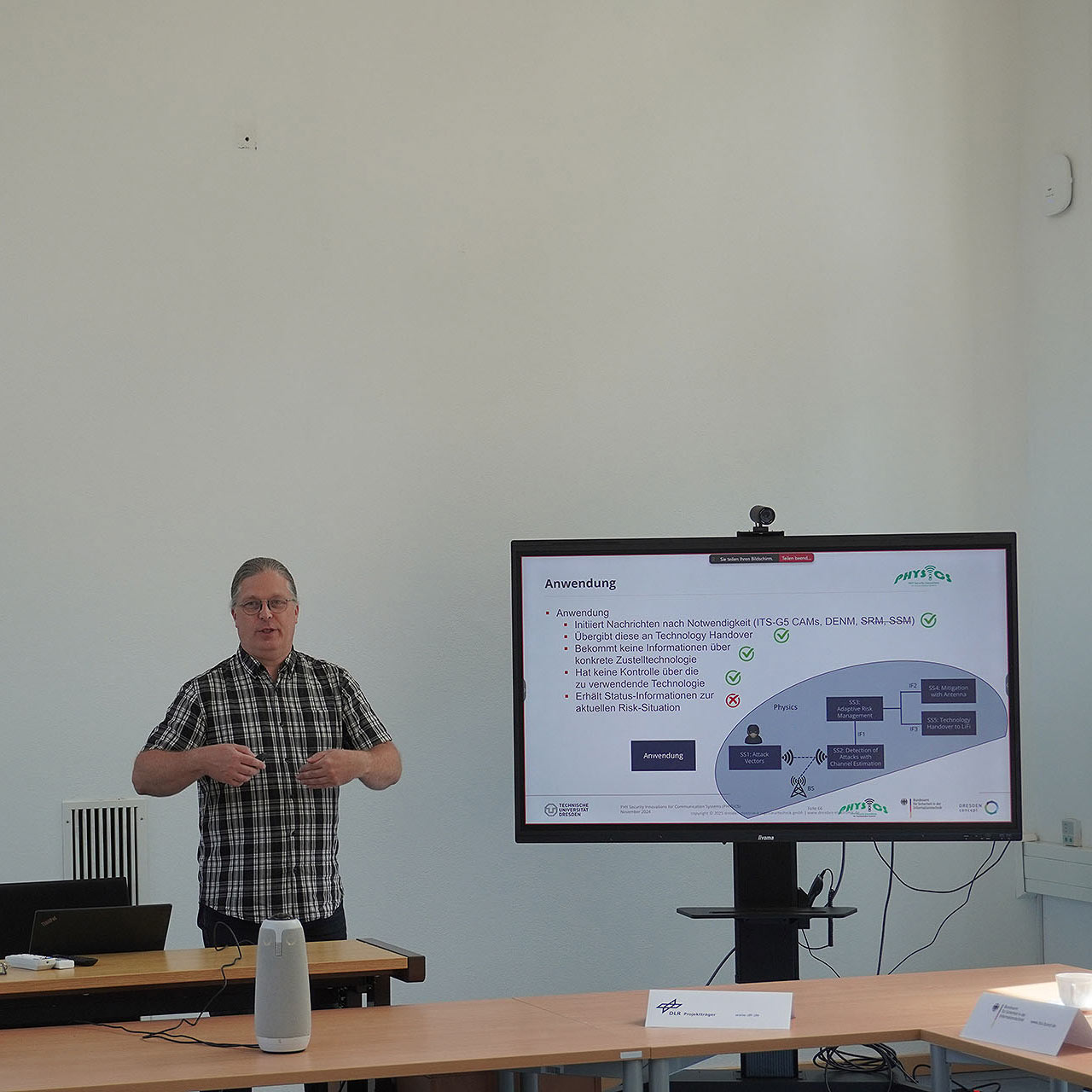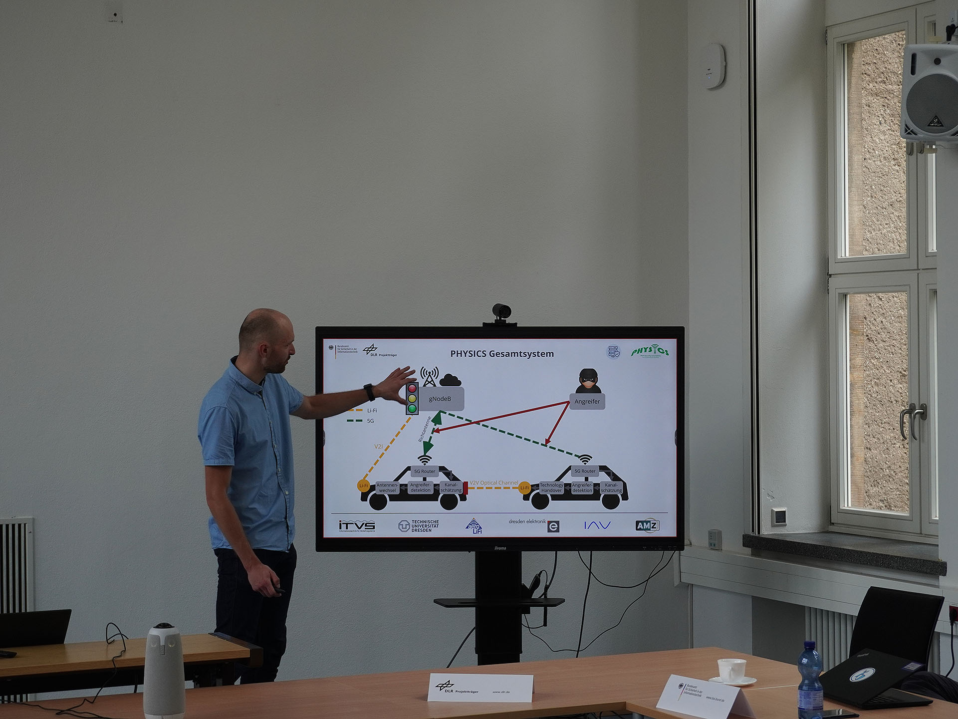 Mit Demonstration des entwickelten Gesamtsystems zum sicheren vernetzten und autonomen Fahren fand am 26.06.2025 der Abschluss des Forschungsprojekts „Physical Layer (PHY) Security Innovations for Communication Systems“ (PHYSICS) statt. Kerninhalt des Projekts war die synergetische Nutzung zweier physikalisch unterschiedlicher drahtloser Übertragungswege – 5G Mobilfunk und optische LiFi-Kommunikation – zur Vernetzung von Fahrzeugen (Vehicle-to-Everything, V2X). Das Konsortium bestand aus der TU Dresden mit den Informationstechnik für Verkehrssysteme (ITVS) und für Big Data Analytics in Transportati­on aus dem Netzwerk Automobilzulieferer Sachsen (AMZ), der aeroLiFi GmbH und der dresden elektronik ingenieurtechnik Gmbh.  Das Projekt wurde über die letzten gut zwei Jahre vom Bundesamt für Sicherheit in der Informationstechnik (BSI) im Rahmen des Programms „Cybersicherheit und digitale Souveränität in den Kommunikationstechnologien 5G/6G“ gefördert.