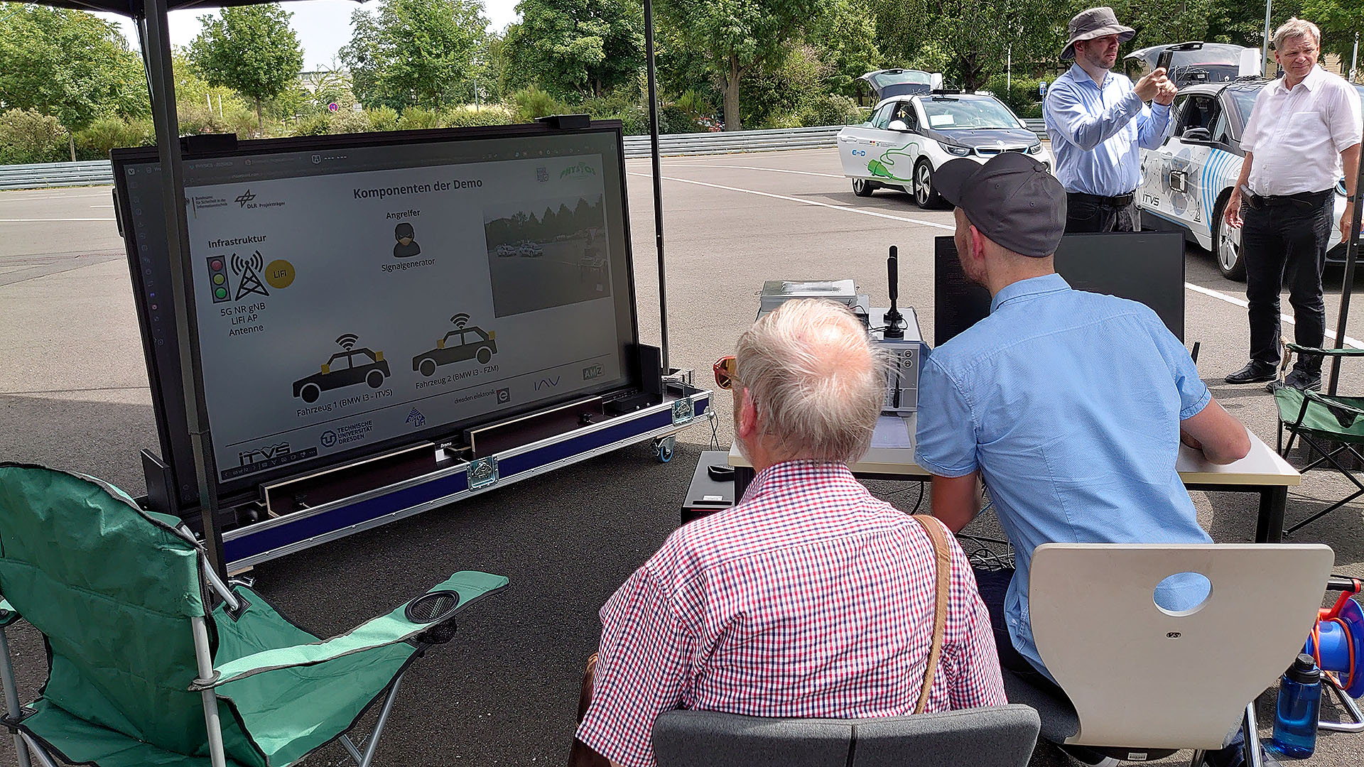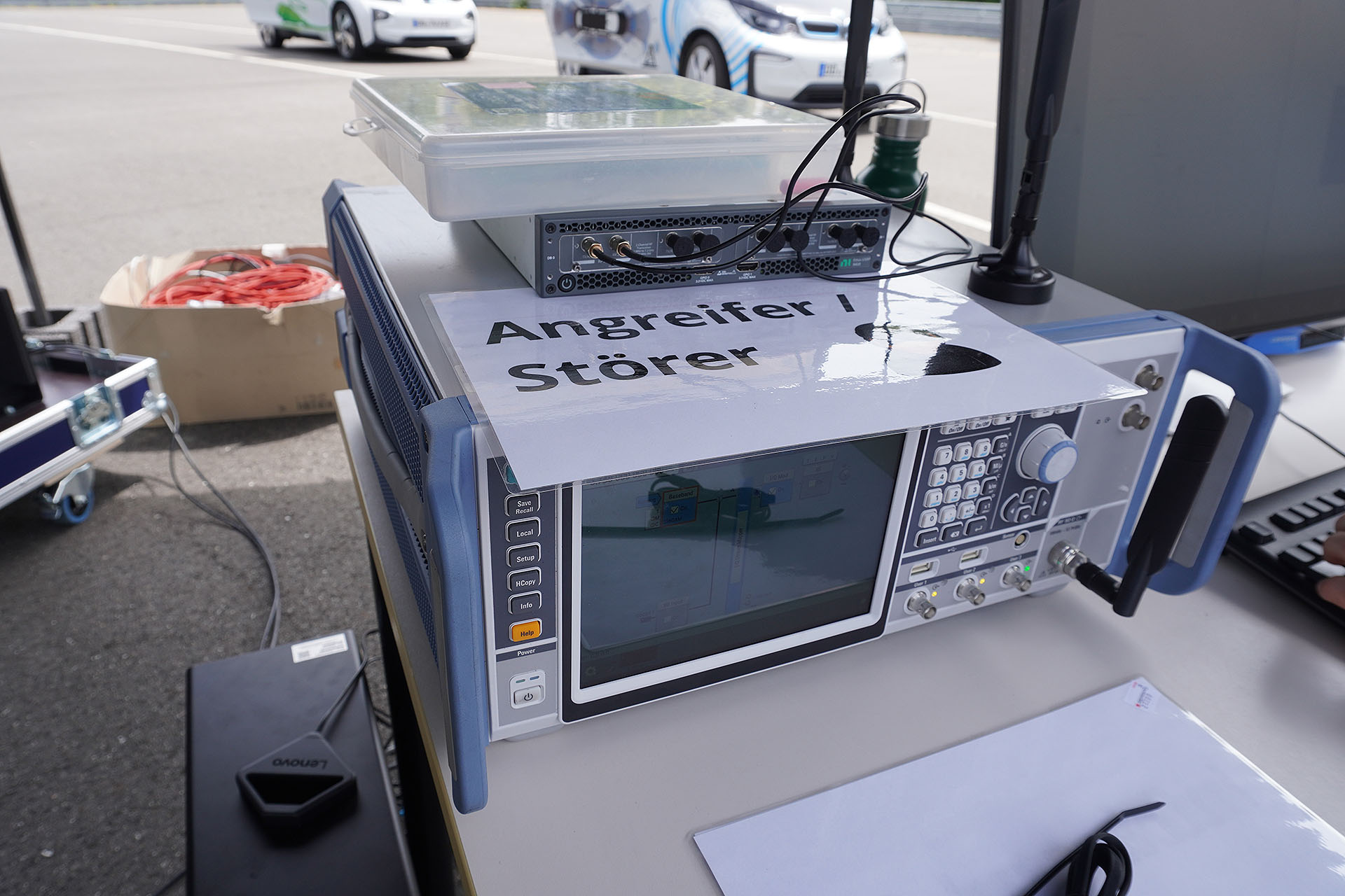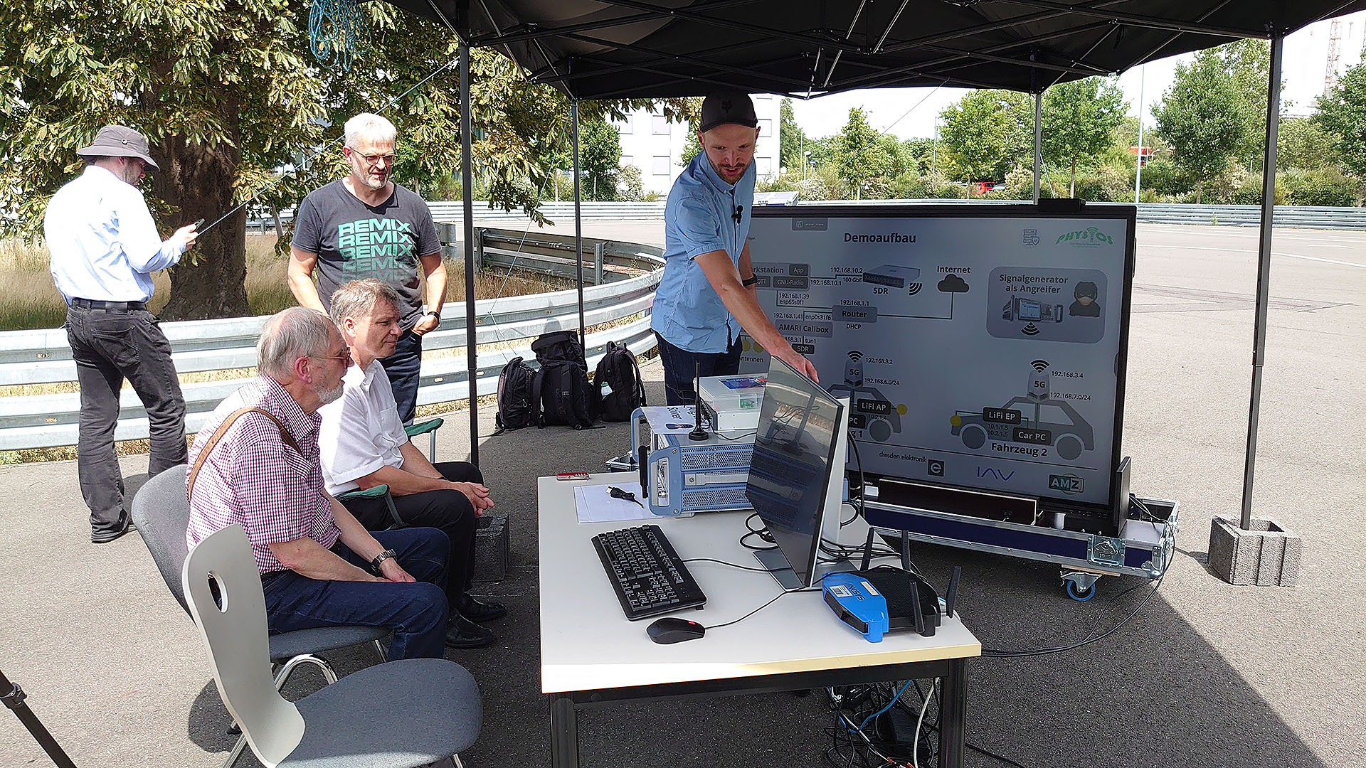 Die Abschlussdemonstration fand auf dem automotive Prüffeld der Hochschule für Technik und Wirtschaft Dresden (HTWD) mit einer Ausstattung von zwei Fahrzeugen und der entsprechenden Infrastruktur statt. Alle Komponenten und das Zusammenwirken der Angreiferdetektion, der Applikationsmanagement und die Gegenmaßnahmen (Handover zu LiFi und Antennenwechsel) konnten erfolgreich in einer V2X-Einsatzumgebung demonstriert werden.